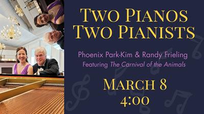 First Presbyterian Church invites the community to an engaging afternoon of music, Two Pianos, Two Pianists, on Sunday, March 8 at 4:00 p.m. Pianists Phoenix Park-Kim and Randy Frieling will perform an exciting program highlighted by Camille Saint-Saëns’ beloved Carnival of the Animals, a playful and imaginative work enjoyed by audiences of all ages.